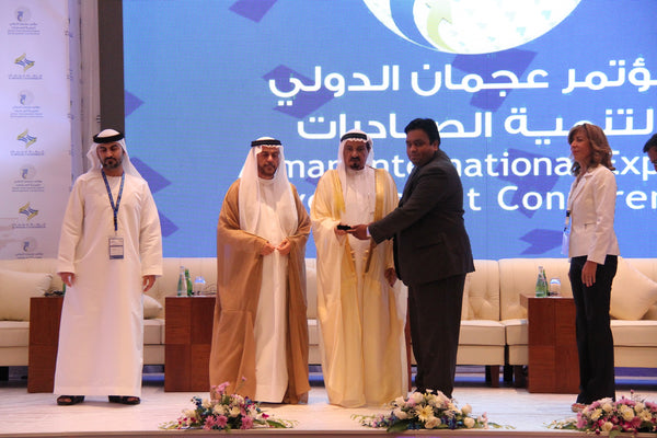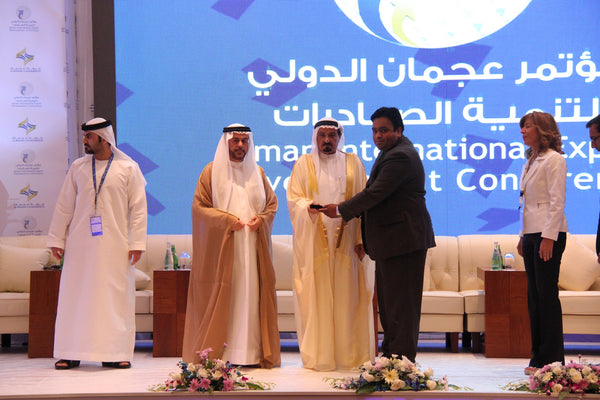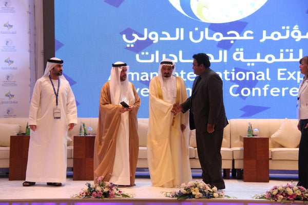 Dr. Usman Zafar receiving an Award from His Highness Sheikh Humaid bin Rashid Al Nuaimi, Supreme Council Member and The Ruler of Ajman during the opening ceremony of the Ajman International Export Development Conference for organizing one of the most successful Trade Show for Ajman Chamber of Commerce.