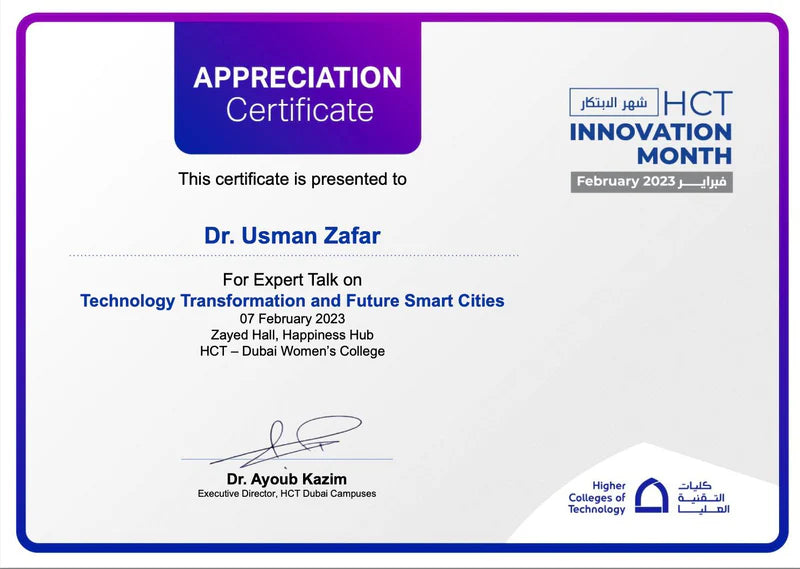 Recognized by the Higher Colleges of Technology (HCT) for delivering an expert talk on technology transformation and future smart cities, contributing to innovation-driven education and thought leadership.