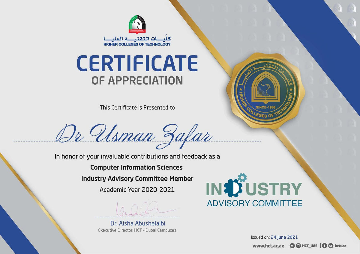 Recognized by the Higher Colleges of Technology for valuable contributions and expert guidance as a member of the Computer Information Sciences Industry Advisory Committee, supporting academic–industry collaboration and curriculum advancement.