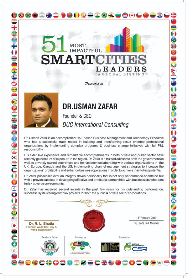 Dr Usman Zafar was honored with an award for “51 Most Impactful Smart Cities Leaders Award by CSR World ” on 18th of Feb 2019.